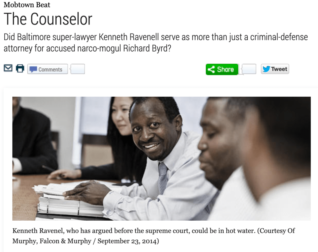 Maryland criminal-defense attorney Kenneth Ravenell has been called the “MVP” of the Baltimore defense bar, a man whose arguments once convinced the U.S. Supreme Court to uphold a ruling that a murder defendant’s statements were inadmissible at trial. But a current federal case against one of his clients, accused drug-trafficker Richard Christopher Byrd, suggests Ravenell may have gone beyond helping Byrd fight the charges: He may have had some role in helping coordinate Byrd’s efforts to conduct counter-surveillance of law enforcers’ lengthy probe into his alleged nationwide drug-trafficking and money-laundering conspiracy.